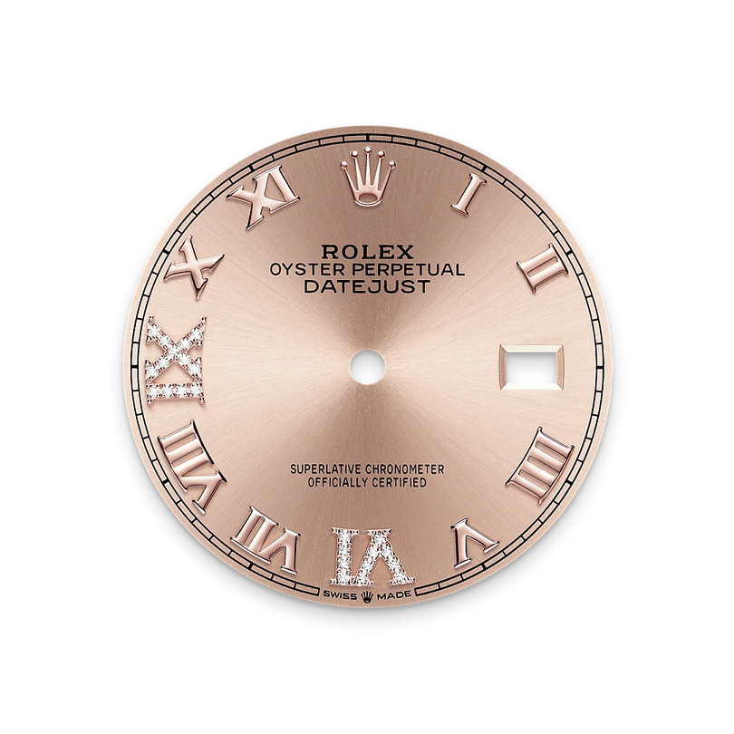 This dial features a Roman VI and IX in 18 ct gold, set with 24 diamonds. The sunray finish creates delicate light reflections on many dials in the Oyster Perpetual collection. It is obtained using masterful brushing techniques that create grooves running outwards from the centre of the dial. Light is diffused consistently along each engraving, creating a characteristic subtle glow that moves depending on the position of the wrist. Once the sunray finish has been completed, the dial colour is applied using Physical Vapour Deposition or electroplating. A light coat of varnish gives the dial its final look.