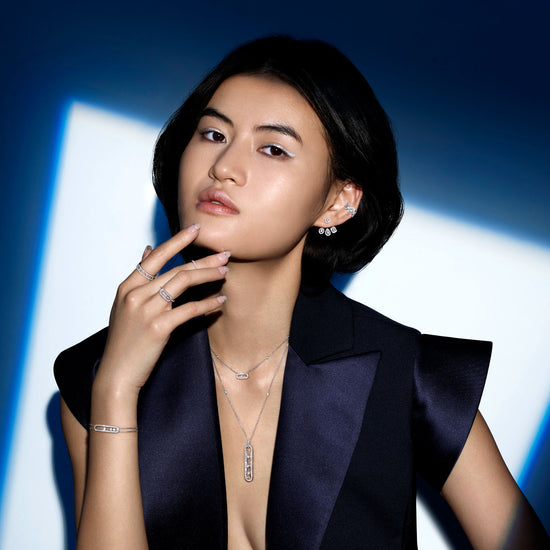 The new Move Uno large model ring gives new dimension to the iconic Messika design. Discover its delicate and sensual openwork, the famous central diamond that moves and sparkles with each movement you make, its oversized proportions that give it bold presence, and its dazzling combination of white gold and diamonds. A Move Uno ring is always the right choice.